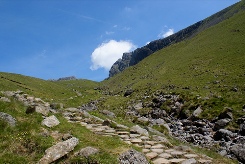 Most of the route is on well defined rock and stone paths. From the campsite you will be constantly climbing for the majority of the route, with very few flat sections. You will meet up with the path from Wasdale Head Green just over 1 km in to the walk, and immediately pass through a gate. Beyond this you will need to cross the stream which feeds in to Lingmell Gill and it is very likely that you will get your feet wet. This crossing may become dangerous after lots of rain. Walking poles to help with your balance would be useful for the crossing. I found the best way across was to aim for the shallowest and calmest section and simply walk though. With a good pair of boots you should avoid getting wet.